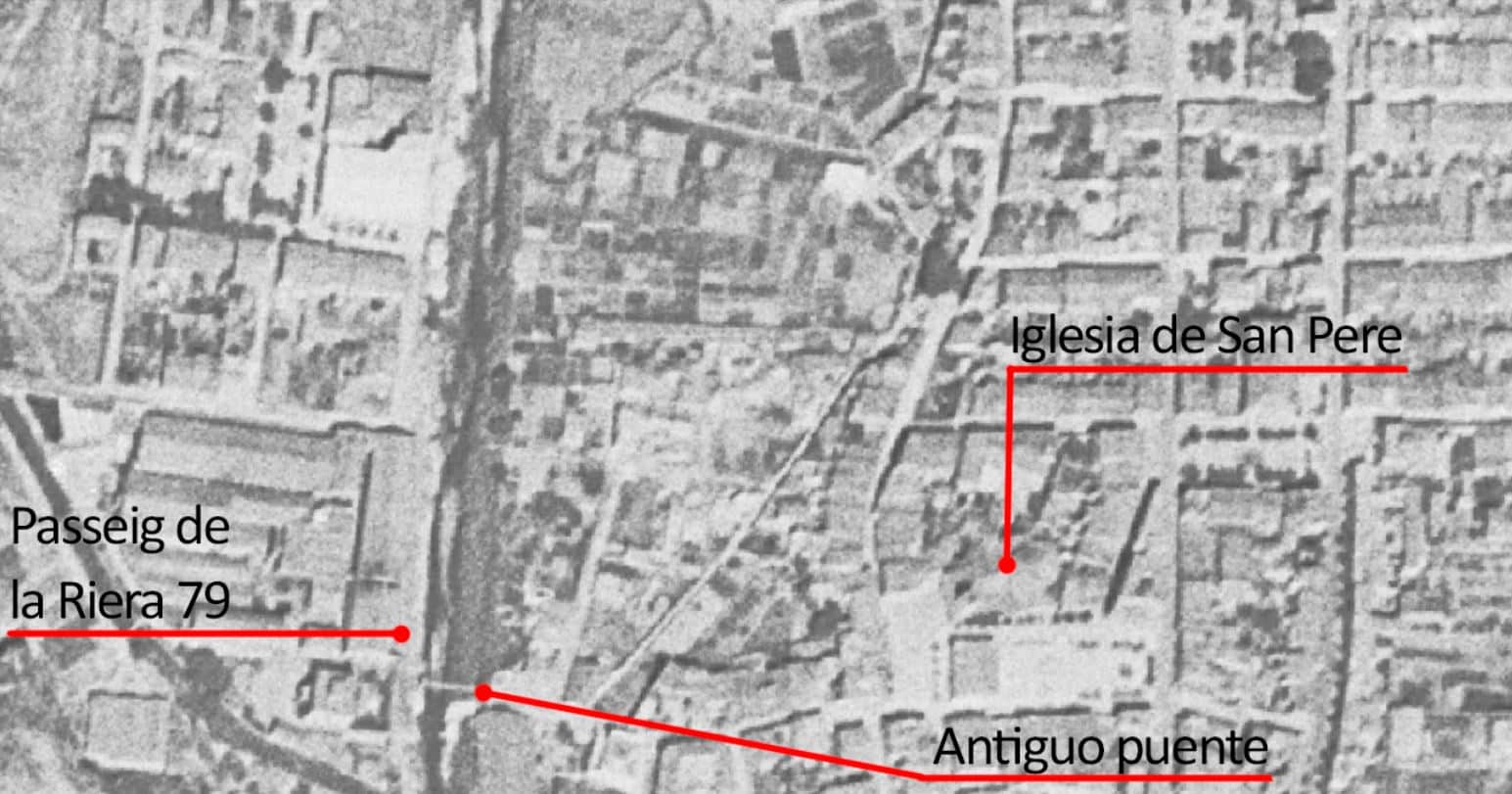 En la imagen se distinguen ya los nuevos puentes construidos para sustituir las infraestructuras destruidas por la fuerza del agua. También se observa el gran espacio abierto correspondiente al actual aparcamiento del Escardívol, un lugar donde, antes de la tragedia, se levantaban viviendas humildes que fueron arrasadas por la avenida. Posteriormente, el solar se destinó a una piscina municipal, y con el paso de los años, el área evolucionó hasta convertirse en el aparcamiento que conocemos hoy.